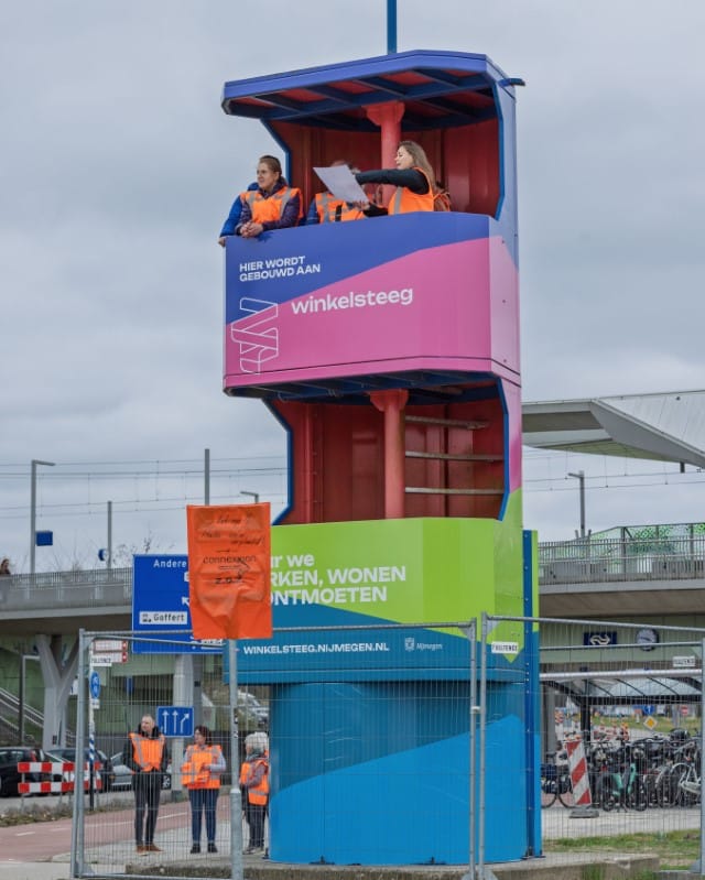 De ‘Gluren bij Winkelsteeg’-toren reist mee met de veranderingen in het gebied. Nu staat de toren in het gebied bij station Goffert. Daar wordt gewerkt aan drie nieuwe onderdoorgangen onder de wegen. Dit zijn veilige routes voor fietsers en voetgangers.