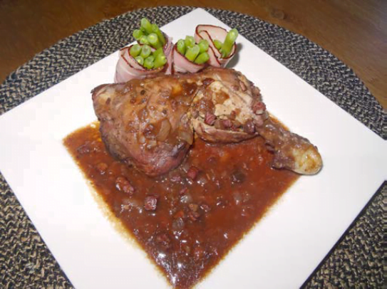 Ingrediënten: 4 stevige kippenpoten 4 stevige uien 3 theelepels gedroogde tijm Beetje olijfolie 100 gram gerookte magere spekblokjes 300 ml. rode wijn. Gewoon de rode wijn die jij graag drinkt ½ pot wildfond (1 pot is 380 ml) 2 el appel- of perenstroop 2 plakjes ontbijtkoek (Snelle Jelle) En voor het bijgerecht: Ja ik weet […]